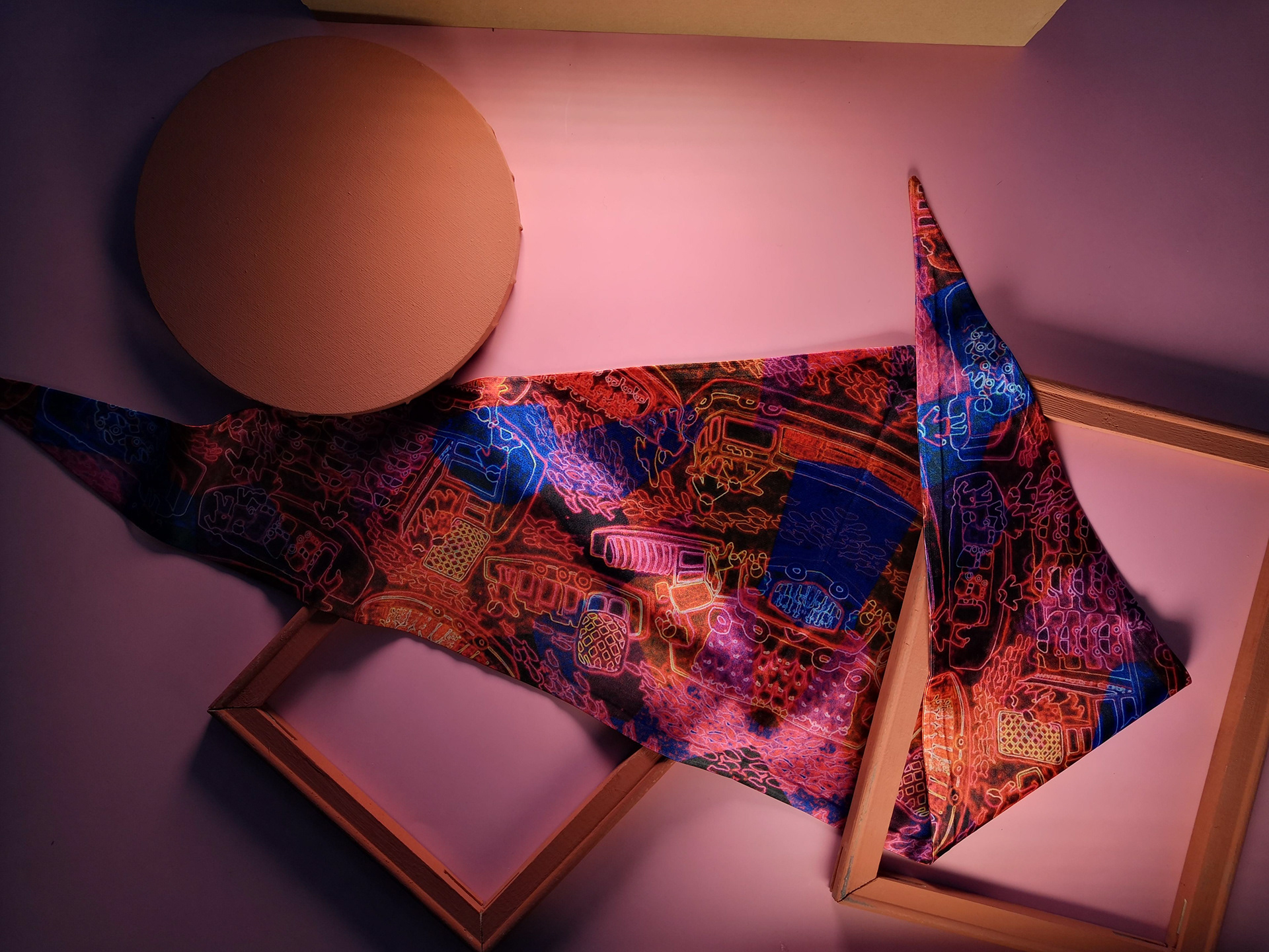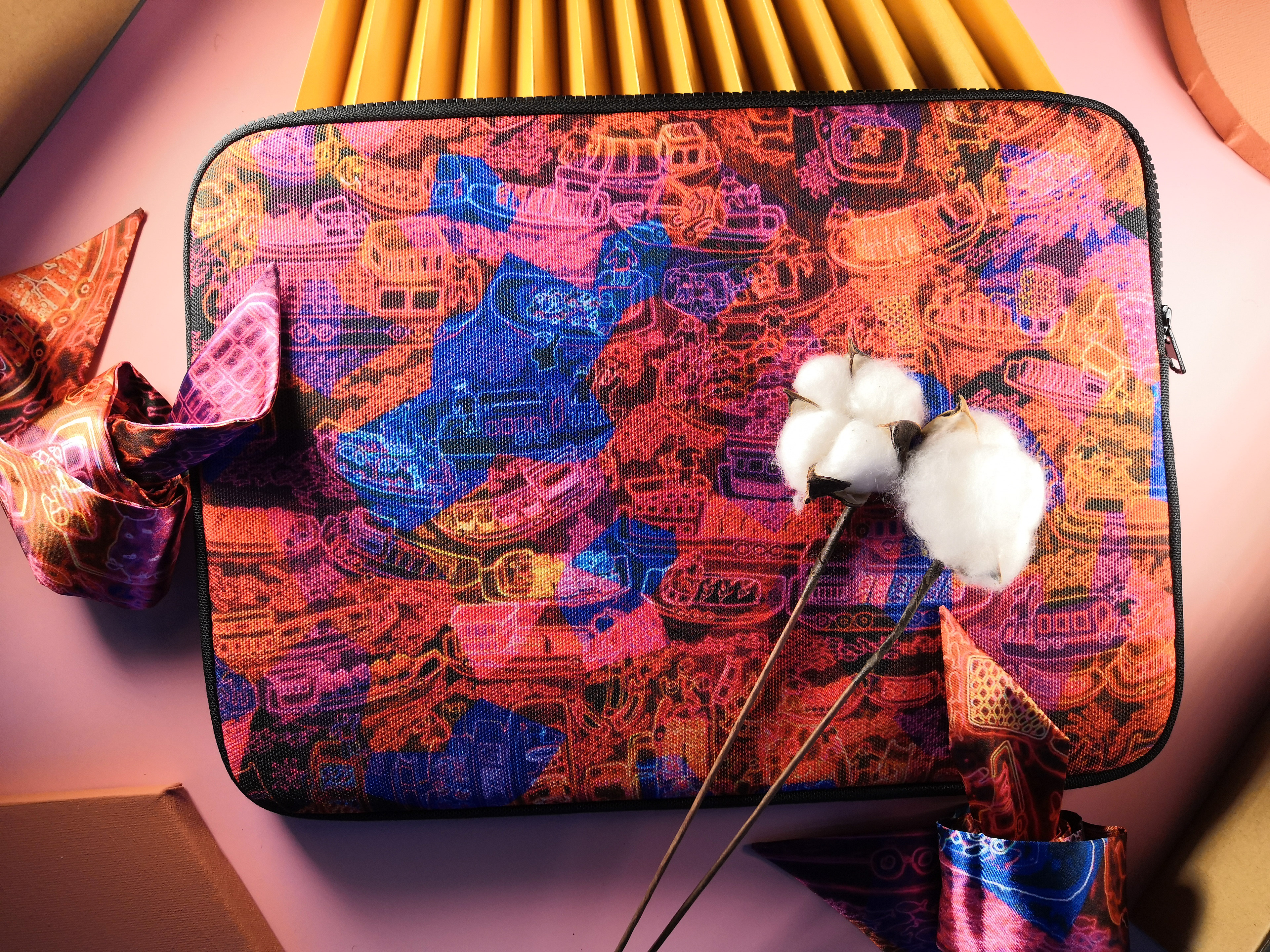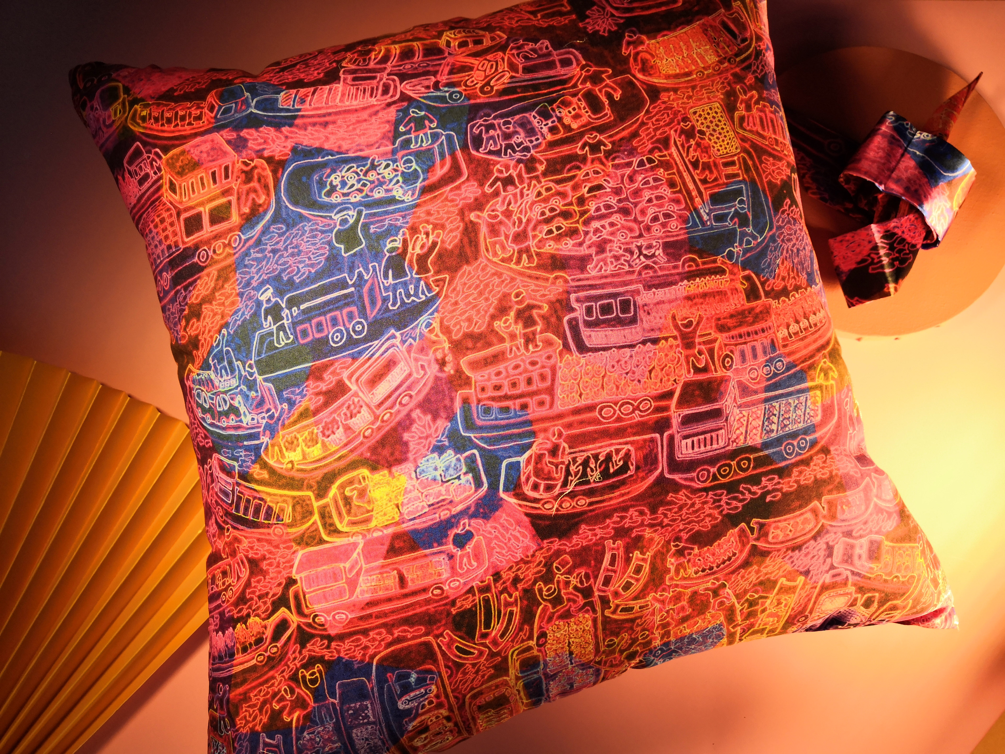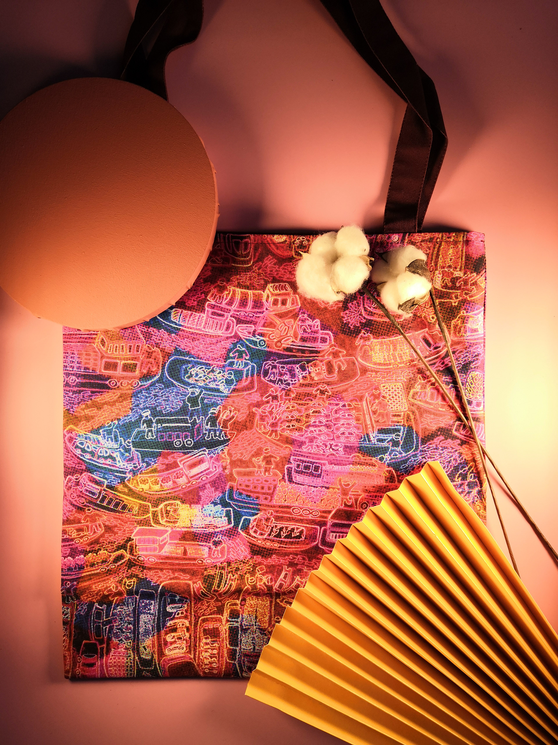 随着现代交通的完善,儿时熙熙攘攘的大运河早已不再,陈寒英老师画作《繁忙的运河》所描绘的运河场景已沦为“历史记忆”。设计师将画作重新改造成“霓虹灯式”的繁华场景,亦幻亦真,瓢忽不定。“霓虹灯式”的大运河场景不仅是装饰日常生活用品的纹样,也是亲子活动中讲述儿时故事、展现江南古镇生活的教具。